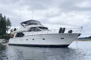 The 5288 Bayliner Pilothouse is a significantly more substantial boat than her other sisters from this brand: she clocks in at 47,560 lbs dry and sports a 16' beam. Her construction methods incorporate the use of syntactic foam between the layers of woven fiberglass on the hull sides to enhance rigidity - there's no wood in the hull sides or bottom of this boat. Her underwater gear boasts large rudders and 3" stainless steel shafts - this is one beefy Bayliner!