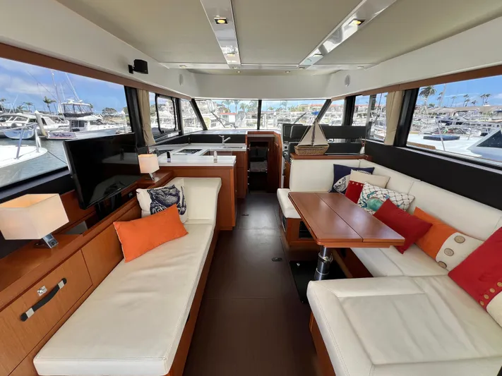 Surrounded by large windows, the salon is flooded with natural light and feels open, modern, and inviting whether underway or at anchor.