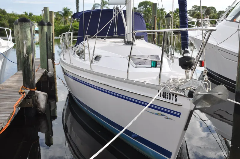 The Catalina 355 features a hull design with a long waterline, moderate beam and freeboard, and a handsome low-profile cabin structure. Everywhere you look on the 355, you'll find features that make sailing for the day or for extended periods a pure pleasure. Precise mainsail control is a snap with a 5' long traveler. Long, inboard genoa tracks accommodate headsails from a powerful 155 percent genoa to a storm jib, allowing a balanced sail plan for all wind conditions. The inboard shrouds and hardware facilitates tighter sheeting angles for upwind performance, and wide, unobstructed weather decks for safety. Some features inspired by her predecessor are an articulating forward berth with innerspring mattress, a dedicated filter locker, large cockpit locker with gull wing hatch and available quad-leaf folding table.