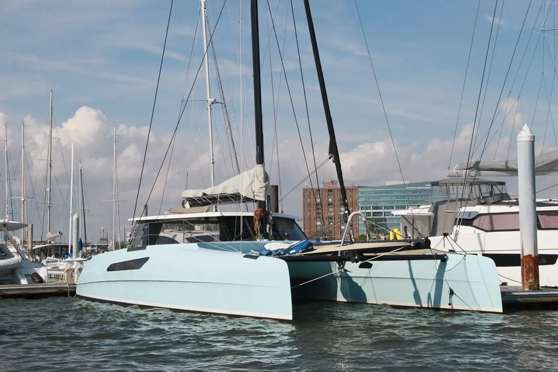 Hull 9 of the Gunboat 55, Starship's decks and hull were constructed utilizing epoxy-infused carbon and corecell foam cores by Gunboat in 2015. Two years later, in 2017, she was finished by Croswait Composites in Wanchese, North Carolina. This 55 was commissioned with ease-of-use and safety in mind, with a focus on owner-operability. While she ticks off the miles with ease and comfort, her systems and sail plan were designed to provide her owners with the ultimate safe yet sprightly cruiser. Starship's long waterline alongside a modest beam result in a very stable, agreeable motion underway in any conditions. Her centerboards offer a minimum draft of 3'8", allowing entry to the most any depth-challenged destination, and their maximum draft of 9'2" provide maximum upwind performance. These centerboards are line-controlled, and in the event of grounding, allow the centerboard to simply retract into it's casing, minimizing the risk of damage beyond line replacement.