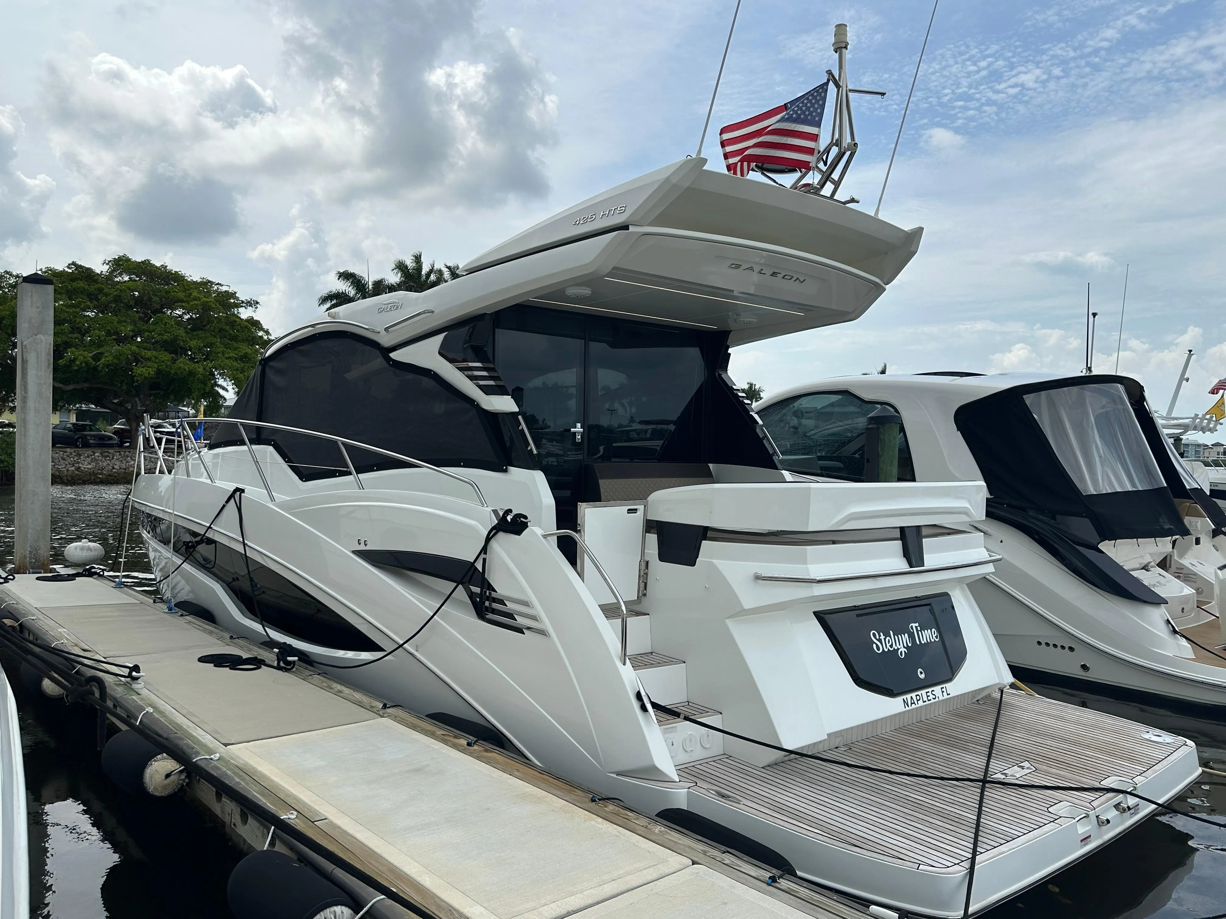 The Galeon 425 HTS is a classic express-style cruiser, and is 44ft LOA and has been meticulously and professionally maintained with industry award winning design! Galeon has re-invigorated the ever popular express style yacht by eliminating the need for soft curtains while still providing a truly open yacht. Close it up and enjoy the climate controlled cockpit or open the massive sunroof, doors, and windows and you can laugh about the old days of fighting canvas to stay dry from the approaching rain shower. The sleek lines and aggressive profile contributes to the abundant natural lighting where functionality and luxury are standard.