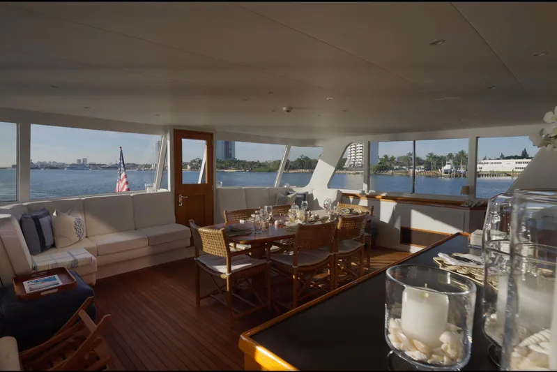 Boarding from the starboard side aft boarding ladder and walking aft, you enter through a side, hinged door into the enclosed main deck aft, a full-beam space surrounded by large windows. Both port and starboard side windows open to allow natural airflow when desired. The area serves as a relaxed, social setting with a dining table for six and two built-in L-shaped sofas aft, offering ample seating for guests. Forward, twin service bars provide excellent storage and functionality, and include refrigeration, an icemaker, and a sink. Access to the expansive lazarette is through a hatch in the floor, aft of the dining table.
