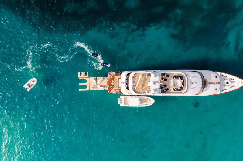 On the sun deck, a large L-shaped bar with five stools, grill, and sink sits forward, while aft you’ll find tender and jet ski storage with a davit. Forward of the bar is a built-in Jacuzzi surrounded by sunpads and four loungers, with a convenient day head to port.