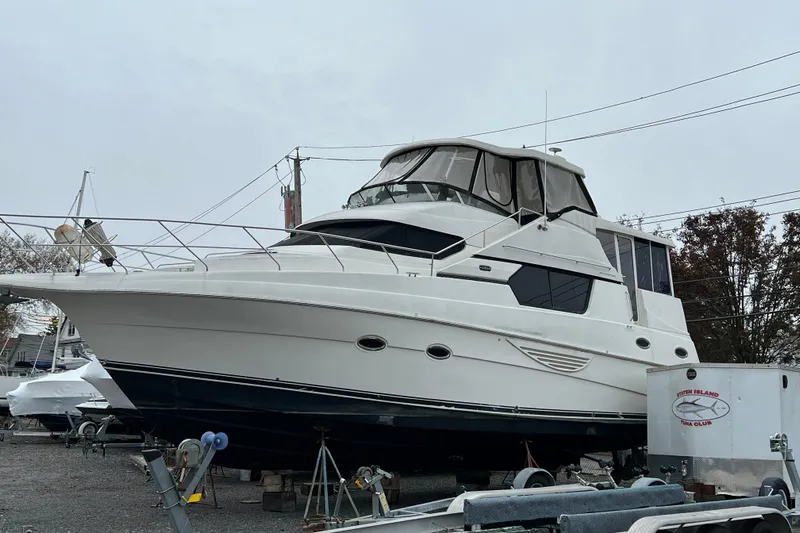 "SUNFLOWER" IS TRULY ONE TO CONSIDER FOR ANYONE SEARCHING FOR A LARGER 3-STATEROOM MOTOR YACHT FOR EITHER EXTENDED CRUISING OR A WATERFRONT VACATION GETAWAY. SHE IS POWERED WITH TWIN VOLVO PENTA 430 HP FWC DIESEL INBOARDS THAT HAVE ONLY 245 HOURS ON THEM. SHE WILL CRUISE COMFORTABLY AT 18 KNOTS AND REACH SPEEDS OF APPROXIMATELY 23. SHE HAS A KOHLER 13 KW GENERATOR (324 HRS.) TO POWER ALL ONBOARD SYSTEMS. SHE HAS A HARDTOP ON THE AFT DECK AND THE OPTIONAL HARDTOP ON THE BRIDGE WITH A NEWER ENCLOSURE ON BOTH. "SUNFLOWER"" IS VERY WELL-EQUIPPED WITH AN UPGRADED RAYMARINE ELECTRONICS PACKAGE INCLUDING RADAR AND AUTOPILOT, HAS BOTH A BOW THRUSTER AND A NEW STERN THRUSTER FOR EXCELLENT MANEUVERAABILITY, AN HYDRAULIC SWIM PLATFORM TO TRANSPORT YOUR WATER TOYS AND AN ENDLESS LIST OF AMENITIES ONE WOULD EXPECT ON A YACHT OF THIS CALIBER. HER CABIN IS LUXURIOUSLY APPOINTED WITH CHERRYWOOD CABINETRY,AND PROFESSIONALLY DECORATED WITH COORDINATING CARPETING, WINDOW TREATMENTS, FABRICS AND DESIGNER ACCESSORIES SHE HAS BEEN VERY WELL MAINTAINED BOTH MECHANICALLY AND COSMETICALLY AND IS IN VERY NICE CONDITION, READY TO TAKE YOU ANYWHERE YOU WANT TO GO.