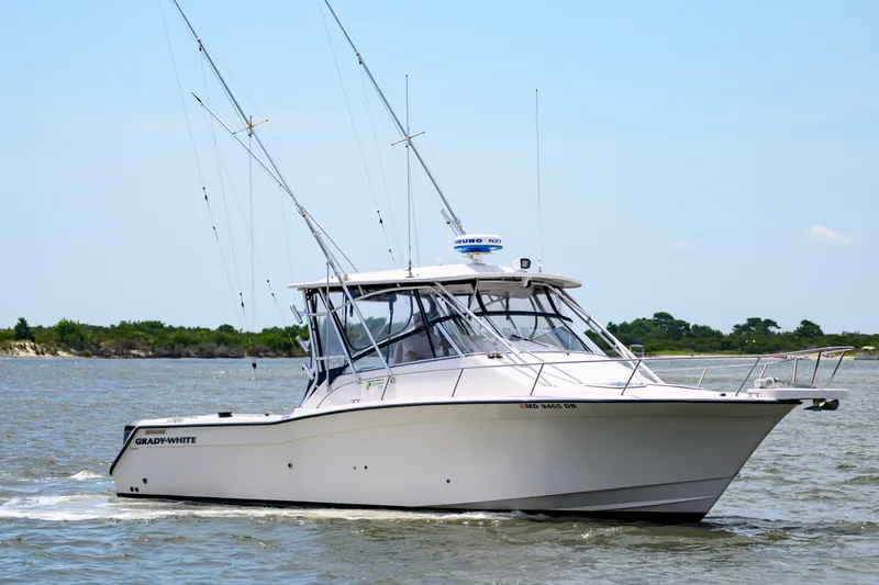 The Grady-White 330 Express is a popular offshore fishing boat! It has a deep-V hull design that provides a smooth and stable ride, even in rough conditions. The boat is 33 feet long and has a beam (width) of 11 feet, 7 inches. It can accommodate sleeping overnight as has a cabin with a head and galley for extended trips.