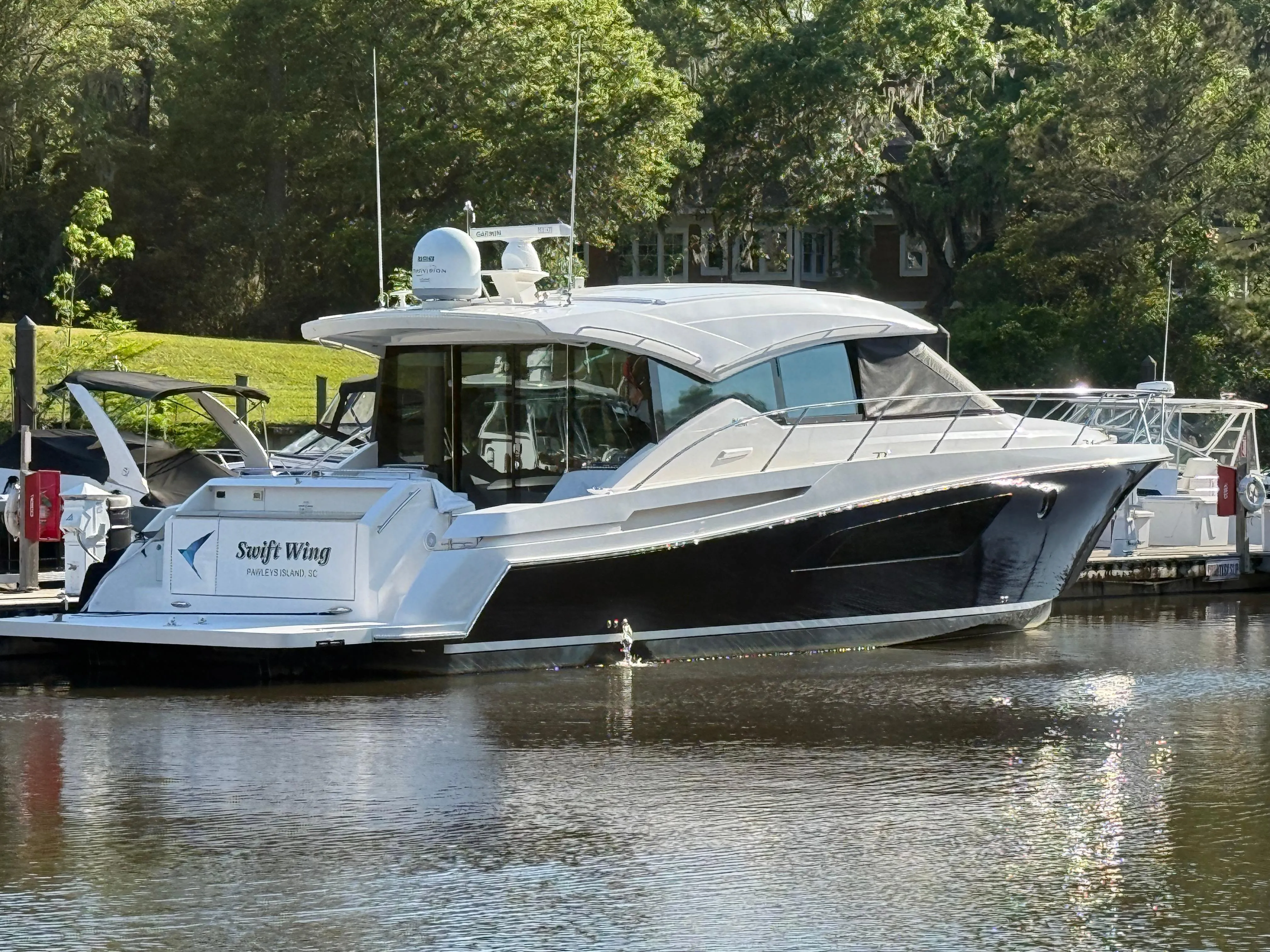 The Tiara 50 Coupe is an innovative yacht well suited for local or extended cruising. The synergy of the aft galley cockpit and salon offers optimum comfort for dining and entertaining. Below deck, two peaceful and private sleeping accommodations for four adults alongside two heads provide space and comfort for all on board. She has it all. A full beam master, Galley up-aft, joystick maneuvering, hydraulic swim platform/tender lift, SureShade cockpit awning, state of the art electronics including Satellite TV.