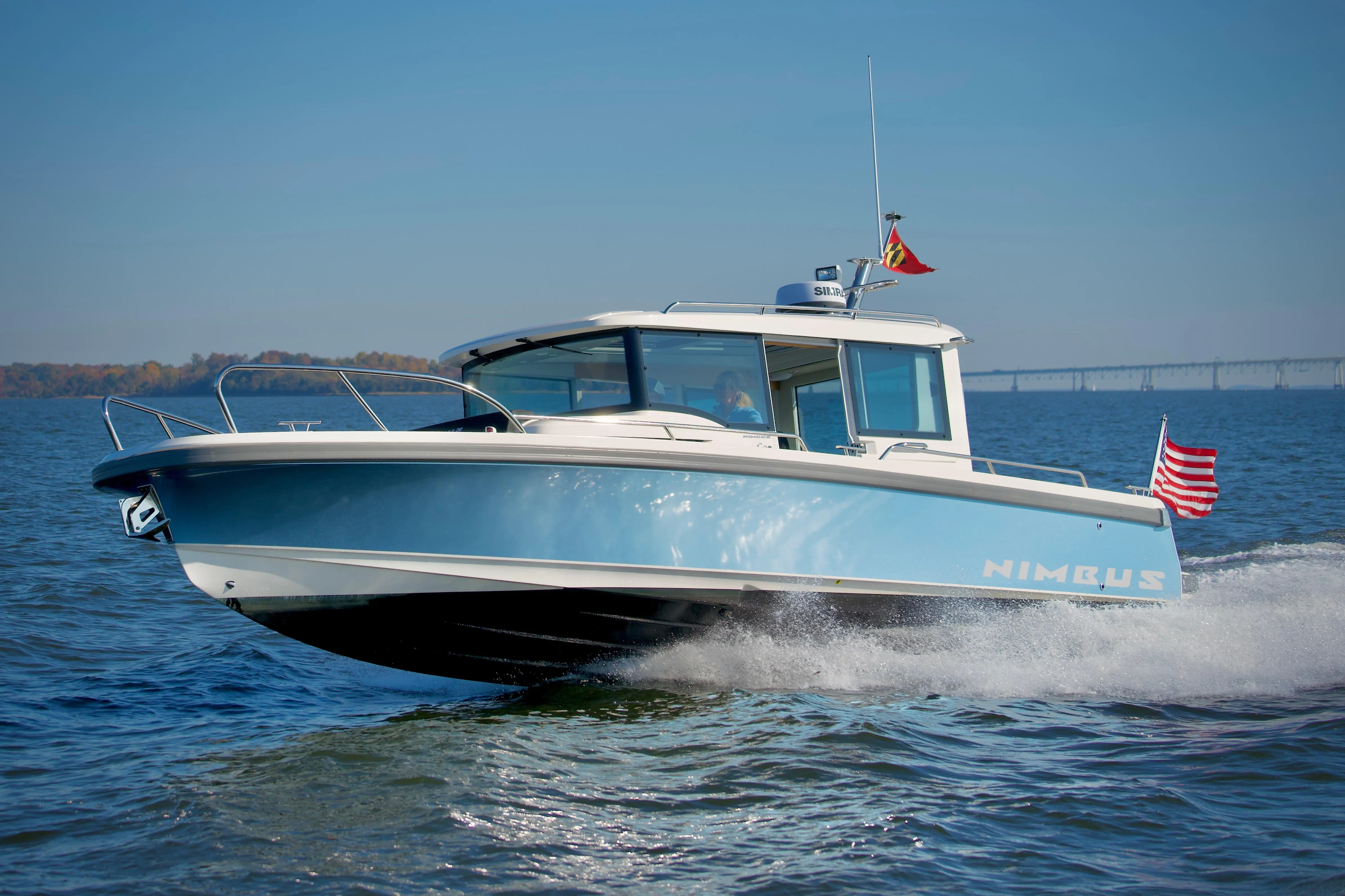 - Equipped with dual 12" Simrad chart plotters, integrated autopilot, and a bow thruster, the Nimbus C9 provides easy navigation and maneuverability.