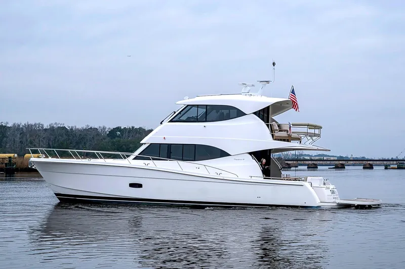 Impeccably maintained and recently upgraded with Dockmate, beautiful new interior upholstery in the salon & flybridge, Starlink, Yamaha Stereo, new flybridge tv, custom innerspring mattress, new start batteries, and two additional cameras.