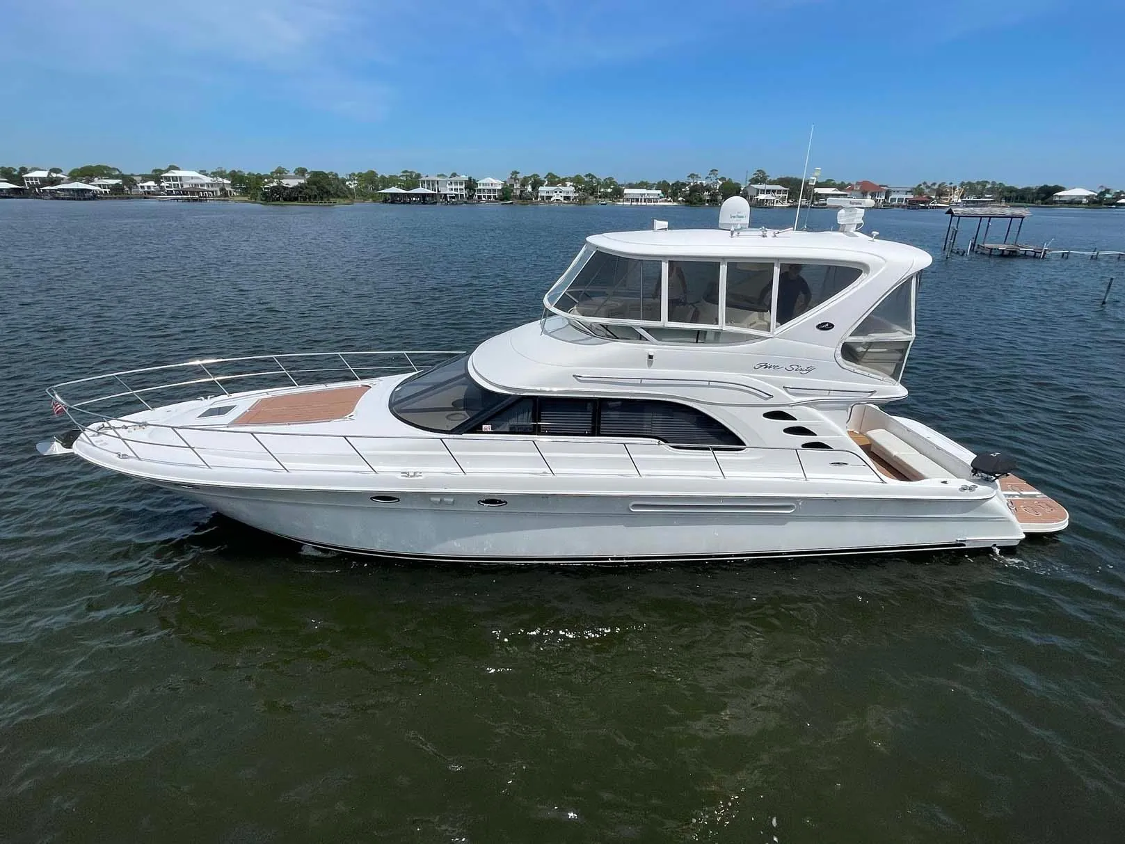 The 560 was one of Sea Ray’s best models when it came to quality, performance, and styling. Her modified V hull, heavy build, and 16’ beam created an excellent and stable ride. Her luxurious three stateroom interior is arranged with the master stateroom forward with ensuite head, VIP stateroom aft and to starboard. Guest head is attached to the VIP stateroom, with the guest stateroom with double bunks to port. Galley up to starboard across from the raised dinette to port. Double couches finish out the aft of the salon; one with storage and a recliner while the opposing starboard couch has a pull out bed. Spacious cockpit has bench seating, storage, and leads to the hydraulic swim platform. Molded stairs to the bridge features a fiberglass hatch to seal when using the air conditioning with ample seating in front of, behind and at the helm. A mix of newer Garmin 16” MFD and a Raymarine open array radar compliment the bridge along with a fridge, wet bar, and clear weather enclosure. Hydraulic platform!