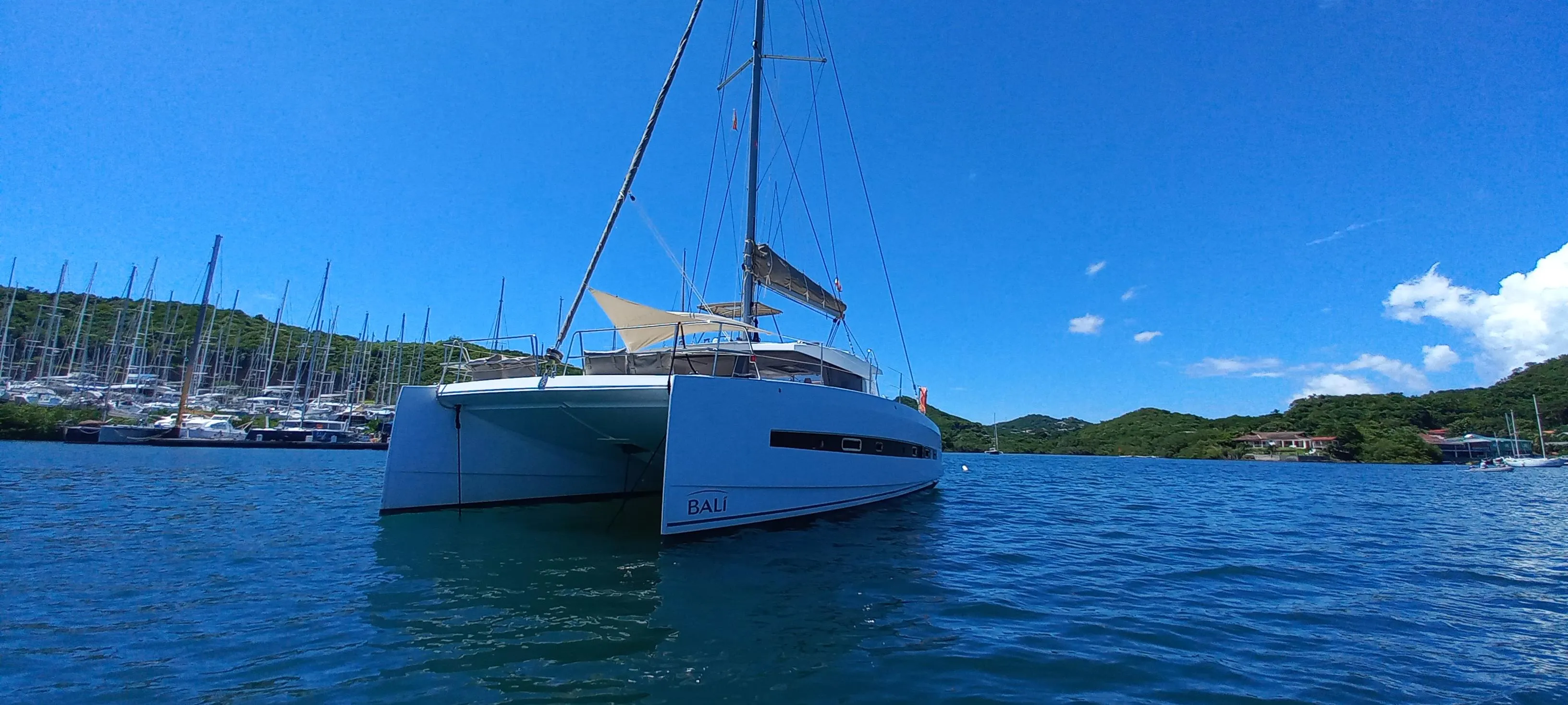 Bali 4.0 Catamaran for sale in Grenada. The BALI 4.0 stands out for its innovative design, featuring an open space saloon and cockpit that seamlessly merge into one by opening the large tilting glass door. This transformation instantly creates a terrace with breathtaking sea views. The forward cockpit offers a comfortable sitting area with removable tables and a spacious sundeck, replacing the traditional trampoline. Additionally, the coach roof provides extra living space with its own sundeck.