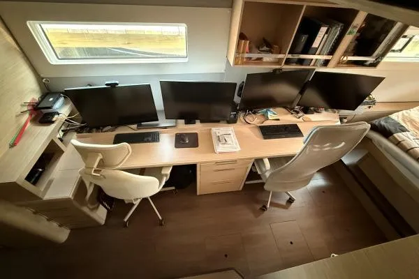 A large (office) desk was installed in the owner's hull instead of the sofa. Additional bookshelves and a drawer unit, including a printer, were also added in the owner's hull.