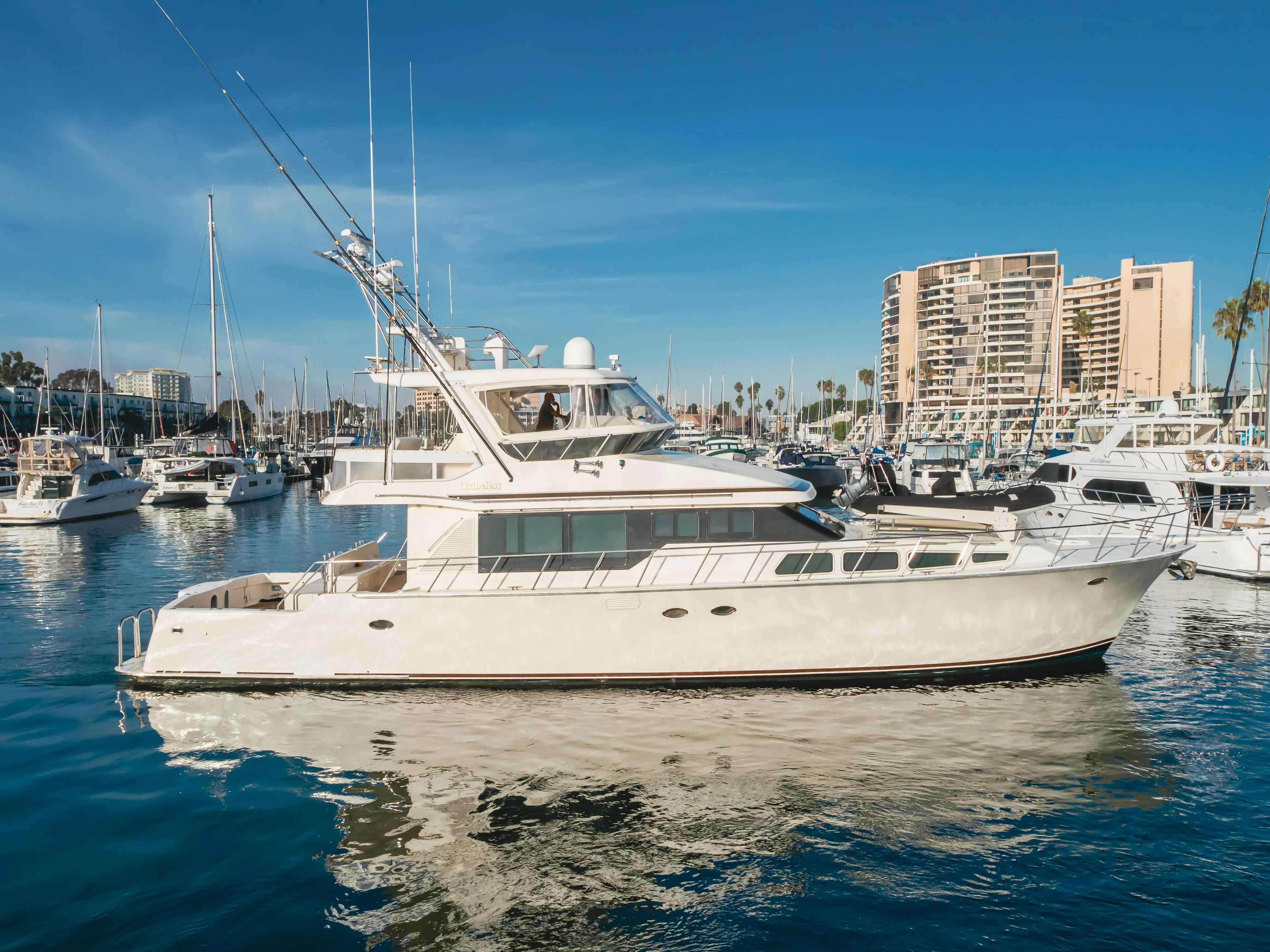 Tribeless’s spacious layout is perfect for a weekend over at the island cruising with friends, or out on a fishing trip doing what the boat was designed for. The open cockpit gives guests plenty of room to move around while fishing, or to set up some chairs and relax in the aft end of the boat, and comes with a convenient dayhead just aft of the salon. Her comfortable and welcoming interior gives guests a perfect place to rest while powering, she has 3 cabins for owner and guests, 2 crew staterooms that can accommodate up to 4, along with 5 heads. A large salon area that opens up to the aft end of the yacht. Her flybridge is the perfect spot to enjoy a cruise on a beautiful day, or to spot fish offshore. Mickelson's ability to offer a vessel with such versatility makes their yachts stand out, and Tribeless is the perfect example.