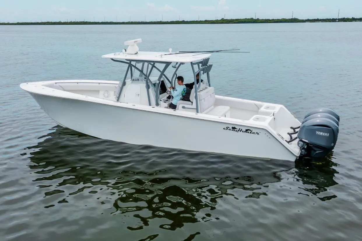 The 2024 SeaHunter 33 Tournament is a dry ride center console that offers all the features of larger tournament boats. This vessel combines fully insulated fish boxes, three standard live wells, and SeaHunter’s unparalleled seaworthiness into a compact, efficient design. Powered by triple Yamaha 300s with only 75 hours, this boat is ready for both cruising and serious fishing adventures. The SeaHunter 33 Tournament includes a range of premium features, ensuring it is equipped for any adventure on the water. Recent survey available upon request.