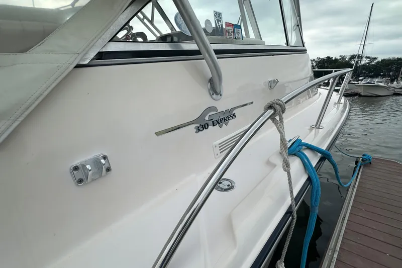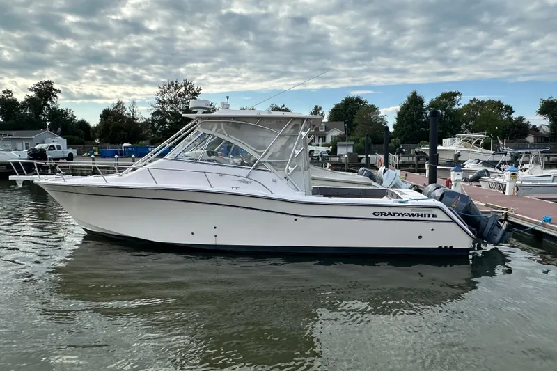 The Grady-White 330 Express has long been ranked among the best-selling express fishing boats of her era. A centerline helm offers excellent 360-degree visibility, and a wide 11'7" beam provides more cockpit and cabin space than most express boats in her class. Updates in 2008 include a raised cockpit floor and windshield for improved helm visibility. Repowered in 2020 with twin 300 Yamaha's! Pop-up electronics pod at the helm. Standard features include an integrated swim/dive platform, hardtop with radio box, 4 kW generator, 45-gallon livewell, foldaway rear bench seat, fresh/raw-water washdowns, cockpit bolsters, transom door, aft-facing cockpit seats, lockable electronics cabinet bait-rigging station withsink, transom fish box, and bow pulpit. Below deck,the attractive midcabin interior of the 330 Express sleeps four and includes teak cabinets, teak-and-holly sole, cherry dining table, full-service galley with microwave and Corian counter, and a roomy head/shower.