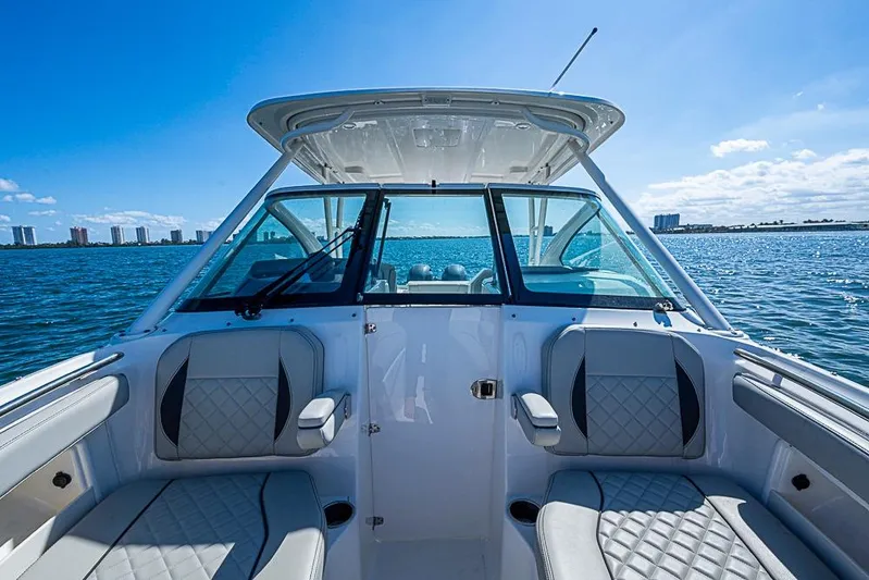 The exterior seating is complemented by the open bow design that has full wrap around seating with plenty of room for family and friends. Add the sunpad option and the social zone quickly converts to a private oasis. A head and sink allow for freshening up dockside. Foldaway seating quickly transforms a social venue to a wide-open, fish-ready cockpit with 20 gallon livewell, gunwale mounted rod holders and transom fish-box.