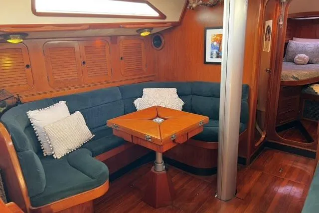 Entering from comfortable center cockpit into the main salon which features a U-shaped settee with a custom teak dinette table to port and a single settee/berth to starboard. There is ample storage outboard and above the settees both to port and starboard.