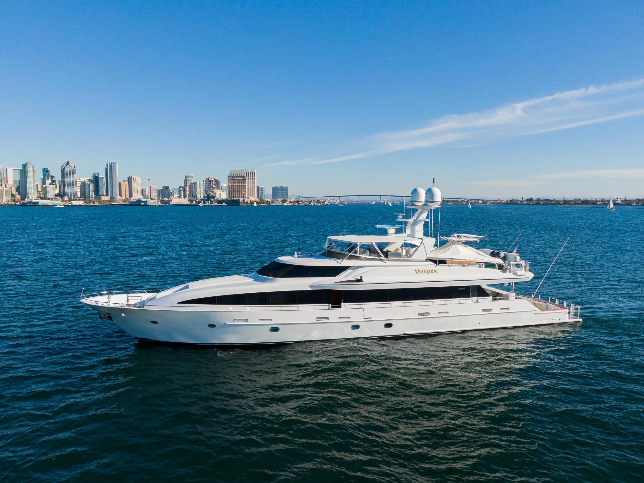 Valkyrie is a fully-equipped luxury superyacht originally custom built for a very experienced yachtsman and sports fisherman. She was designed with a shallow draft (6'6") and a foldable arch allowing her easy access to waters around the globe without limitations. She has an enormous cockpit tournament rigged with an offset fighting chair, rod holders, tuna door and commercial icemaker--perfect for fishing around the world. An 8,000 lb davit which can launch tenders to port or starboard of the reinforced flybridge. Her 1,800 hp MTU 16V2000 diesels can provide an 18 knot cruise speed while she boasts a 6,000 mile range at 8 knots. Her interior features a beautifully designed 4 stateroom layout with crew's quarters which will accommodate up to 7, an expansive country kitchen with granite countertops, a large, comfortable salon and dining area. Stunning mahogany woodwork is found throughout. She is meticulously maintained and has been continually upgraded. VALKYRIE is a must see, one of a kind world fishing and cruising vessel.