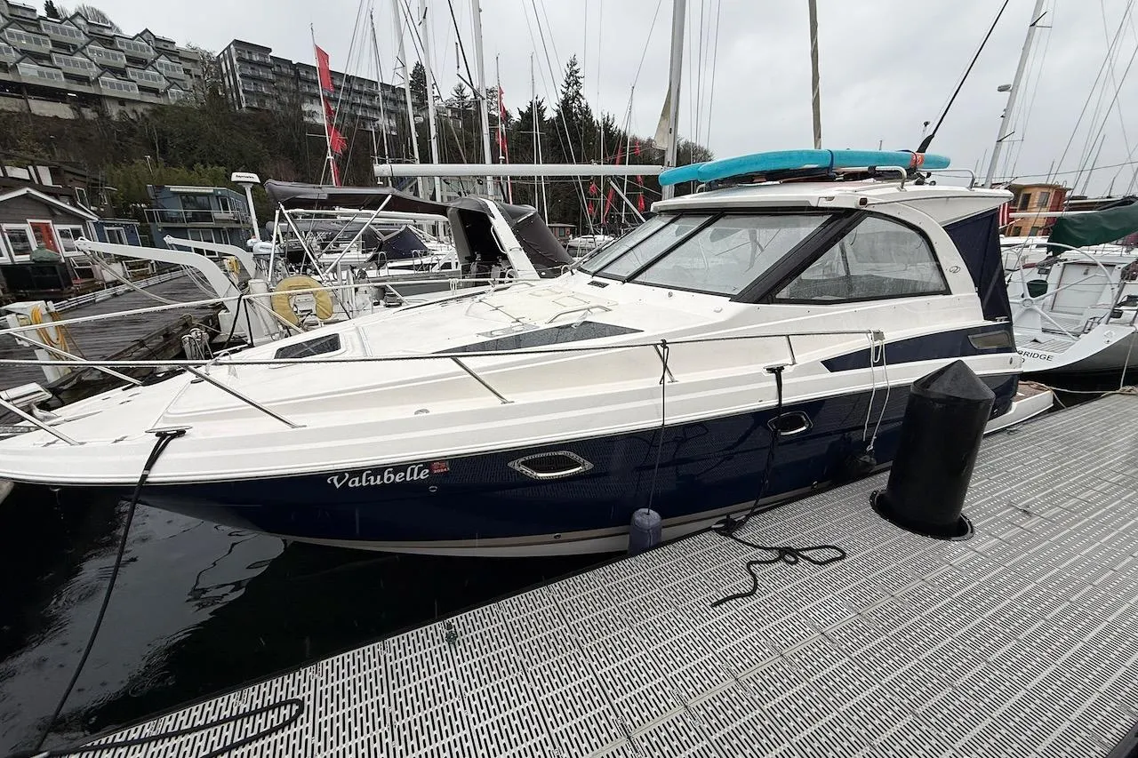 Below deck, the cabin is bright and surprisingly spacious for a 35-footer. Large hull windows flood the salon with natural light, while rich cabinetry and upscale finishes create a refined, contemporary feel. The forward berth, well-appointed galley, and private aft stateroom make overnighting comfortable for family and guests alike.