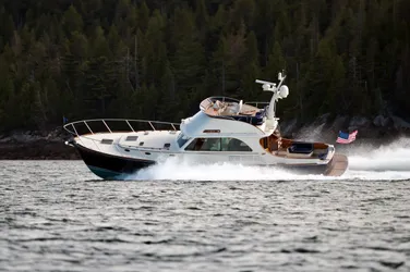 The interior layout makes living aboard comfortable and provides abundant entertaining space. Forward is the full-beam master stateroom, starboard is the dinette which ingeniously converts into a second berth with a hidden door, two full heads with showers and a well laid out galley which opens to the salon above. The fully equipped helm station in the pilothouse allows for enclosed operation of vessel with excellent visibility. Ample starboard and port seating in the pilothouse (convertible to additional sleeping accommodations) with numerous entertainment options.