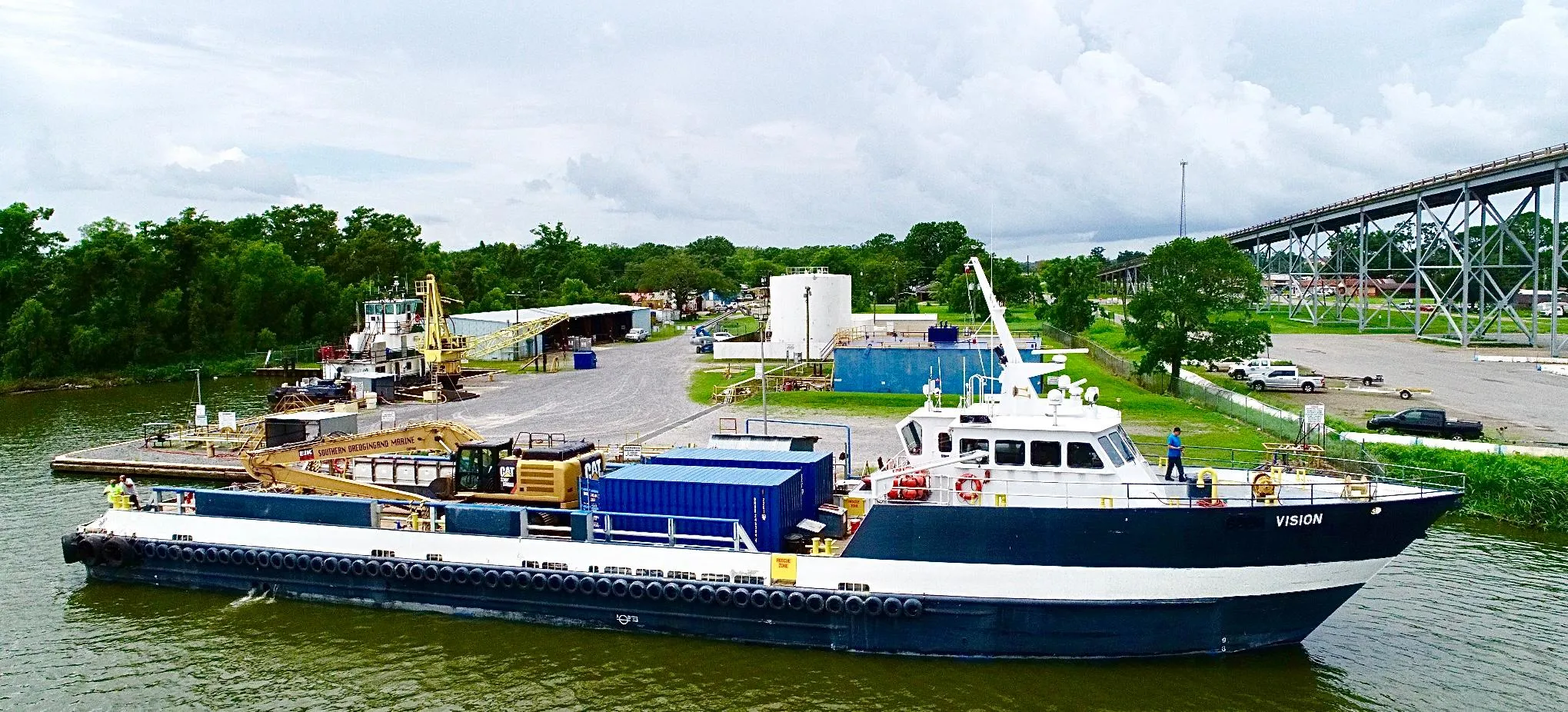 There's a CAT 336 Excavator on the aft deck with a long reach arm, used for dredging under water, which will be removed along with all dredging equipment, containers etc., once under contract.