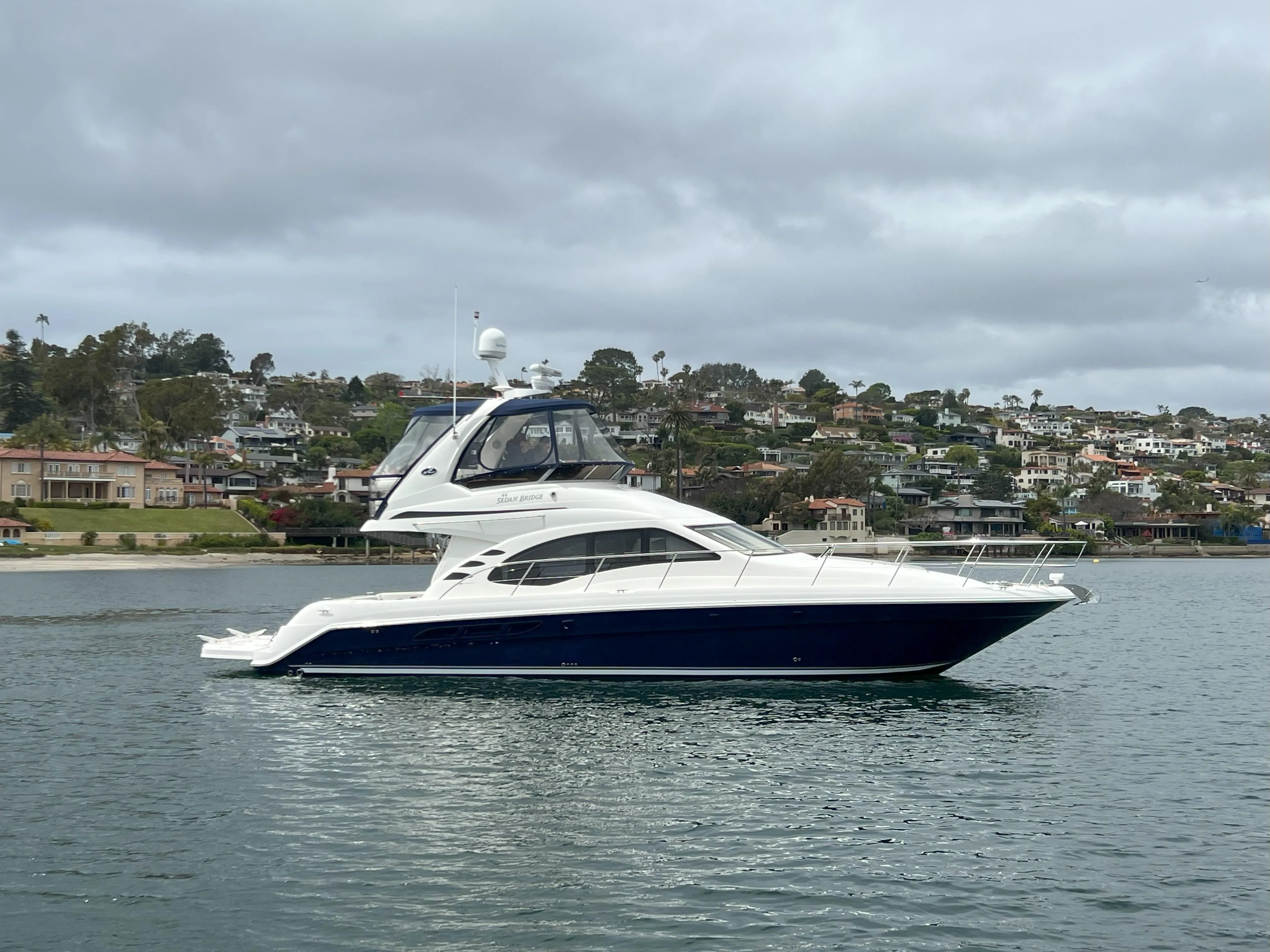 No matter where you plan to go, you'll arrive in style with the Sea Ray 44 Sedan Bridge. From its seamless fiberglass spoiler and Sunbrella soft top, to its graphic striping at the water line, this impressive sport yacht is sure to command attention. And thanks to the power of its twin Cummins MerCruiser QSC 500 diesel engines no matter where you're headed, you'll arrive ahead of the rest.