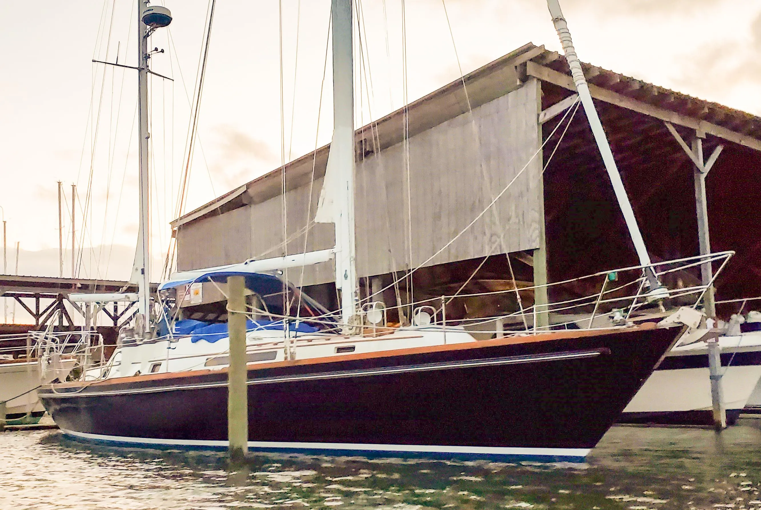 Solid Fiberglass Hull with deep keel stub and 11,600 lbs. of lead ballast heavily bolted and secured to stub with stainless through-bolts and stainless anchors.