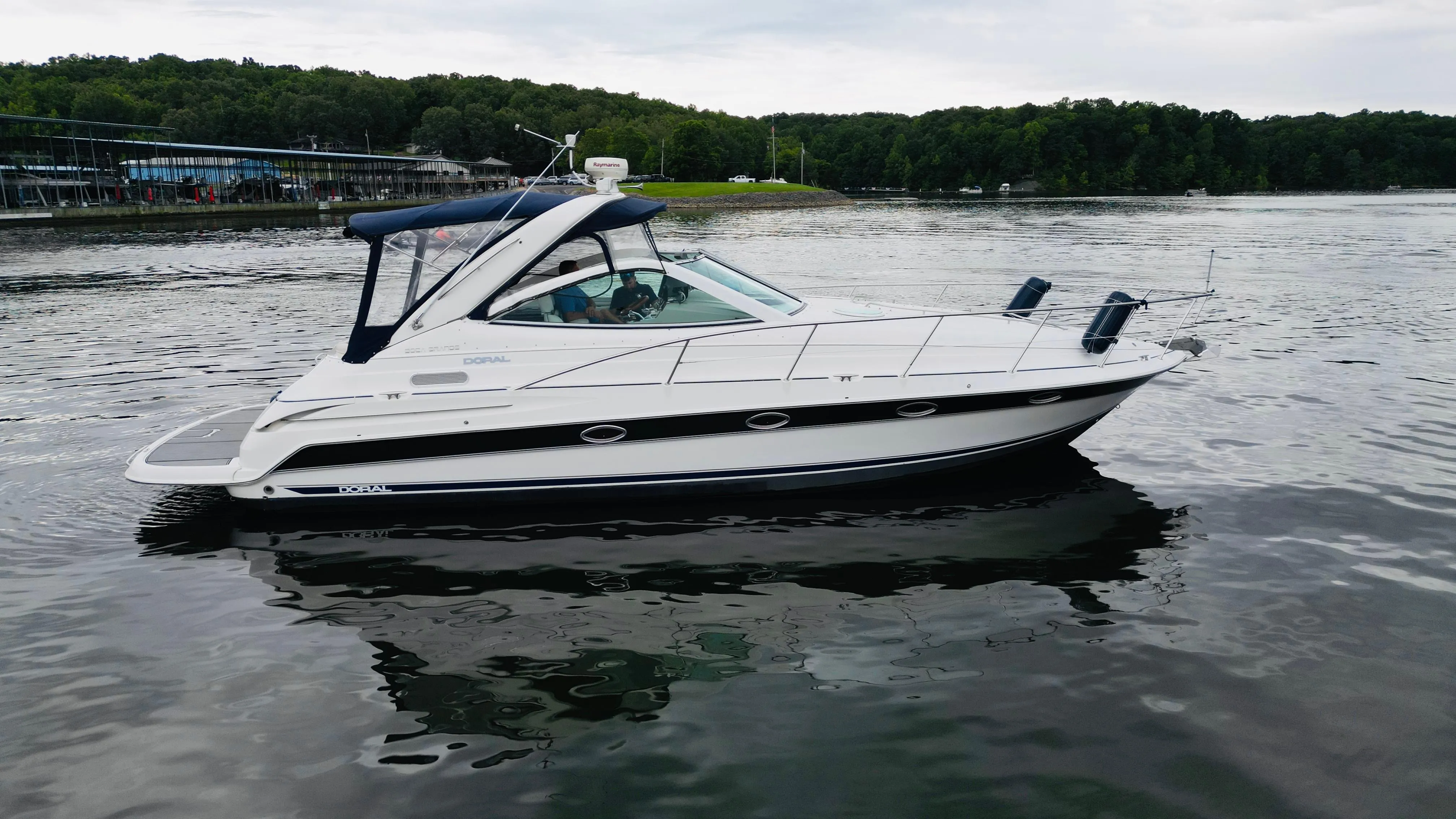 The ultimate choice in cruising and entertaining is the Boca Grande: Doral's flagship cruiser. Step aboard and feel the Doral difference. The sleek design and the standard features and options available will make owning this boat the ultimate pleasure. This vessel shows extremely well and it's obvious that the owner maintained it well during his 7 years of ownership. She's powered by closed cooling Merc. 496 MAG's with around 740 hours and has lived her life exclusively in freshwater. The 496 Mag's are paired with Bravo 3 outdrives with outdrive showers installed. Out on the water she is powered by a Kohler Gen. with 1190 hours. She comes equipped with a full isinglass enclosure as well as a cockpit cover. At the helm, the captain will appreciate the installed Nav and radar that are easily viewable at eye level. Not pictured, but included, are sun pads for the bow for those weekends tucked back in a bay. The installed windlass comes with ample chain for confidence while on the hook. The radar arch is electric and can be lowered in the event of a height clearance issue. The cabin has a built-in central vac system for your convenience and a bilge-safe heater is installed to extend your boating season. The owner reports all systems are fully operational except the windshield wipers which have been removed. The slip does not convey with sale. See the full exterior and interior walkthrough video to fully appreciate how clean this Doral is.