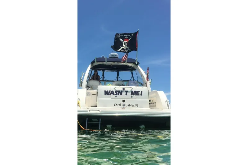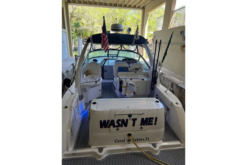“WASN’T ME” offers a comfortable, well-appointed cabin layout that sleeps six and centers on quality finishes. The interior features custom teak flooring and cherry wood cabinetry, LED accent lighting, and a full galley with stainless fridge, electric cooktop, microwave, and built-in coffee maker. The salon’s crescent sofa converts to a roomy berth and two flat-screen TVs keep guests entertained; the full head includes a separate shower. Overall the interior reads clean, bright, and turnkey, a nicely kept Sundancer well suited to weekend cruising or extended trips.