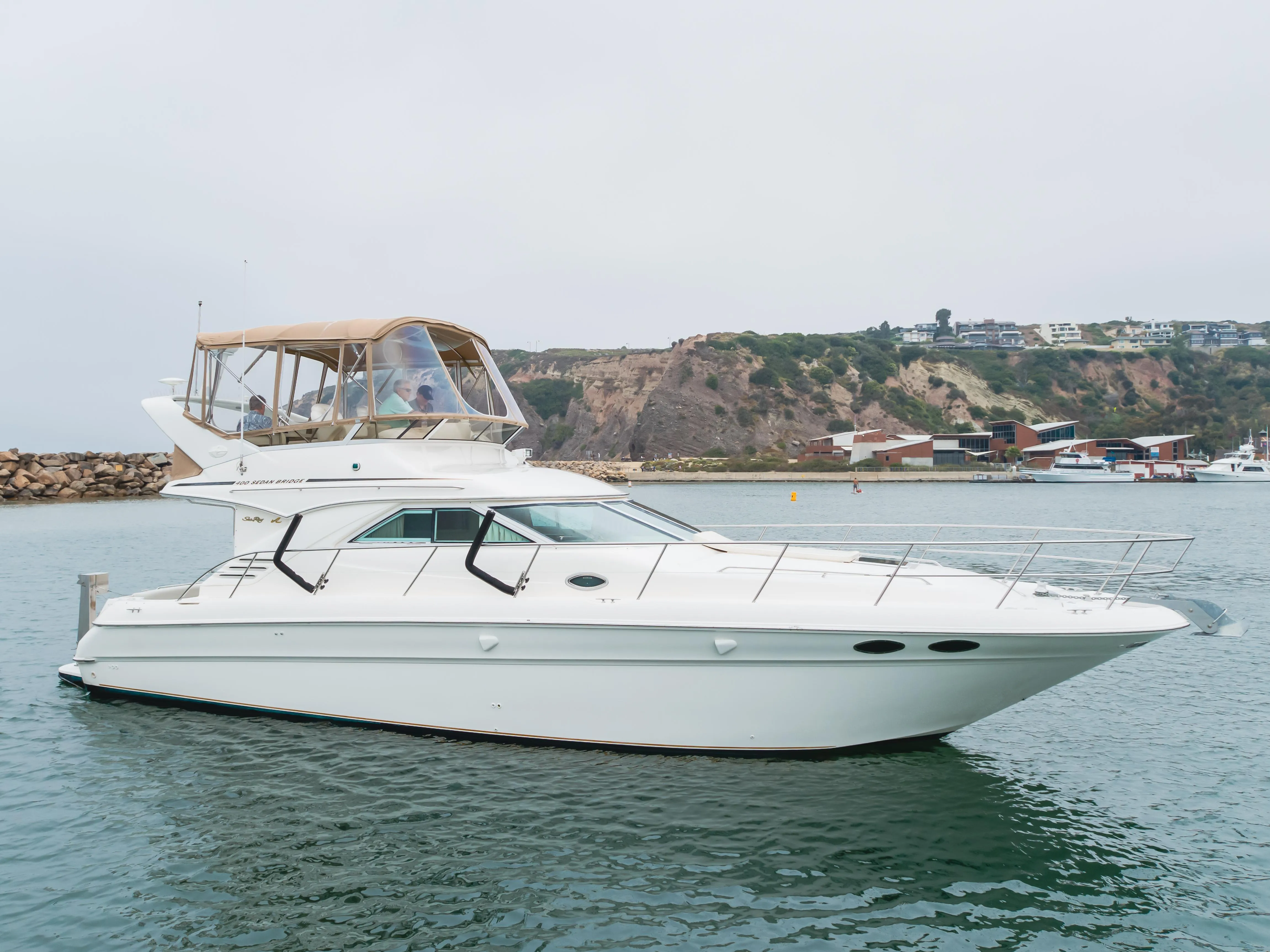 The Sea Ray 400 Sedan Bridge has individual options ranging from engine upgrades to a lower control station, and there's also a choice between two complete bridge plans and cabin layouts. The gracious standard cabin layout of the 400 Sedan Bridge has two large staterooms, two head areas, and a spacious midlevel galley with a salon-level breakfast bar. The forward stateroom has a full-size bed, cedar-lined hanging locker, floor storage, private head and shower, and a standard entertainment center with a TV - VCR - radio combination. The two twin beds in the port stateroom easily convert to a king-size bed. There's plenty of room for stowing personal articles in the hanging cedar-lined locker, built-in drawers, and floor storage. The guest head with shower is right next door. The magnificently finished galley has wood cabinetry, a flush-mounted three-burner electric stove, refrigerator with freezer, microwave, and coffee maker. The salon comes complete with an electric sleeper sofa, entertainment center with TV - VCR - radio combination, cocktail table, and a full dinette which can be replaced with an optional lower control station. An optional floor plan allows for a third stateroom to starboard with bunk beds, locker, and built-in storage drawers. Both plans feature deep-pile marine-grade carpet and two choices of granite-colored countertops and tables, with handcrafted wood trim throughout. Molded steps with a security hatch and gas-assisted latch provide safe access to the spectacular bridge, which offers a choice of two seating plans. The first allows for a starboard helm station with added room for electronics and custom slide and swivel helm seats. The second plan provides plenty of room for socializing with a portside helm station with dual companion seat plus spacious U-shaped bridge seating with a sunpad, filler cushions, and cocktail table. For good looks and easy maintenance, both designs include snap-in carpet liner, burl instrument panels, an aluminum framed venturi shield, fiberglass spoiler, Bimini top enclosure, new bridge aft enclosure, and a double sunpad aft of the seating area. The self-bailing fiberglass cockpit is equipped with a gas-assisted bilge service hatch, aft and side panel storage, fender storage tastefully concealed in the transom aft wall, even an ice maker. Here's another Sea Ray touch - the battery on - off switch is in the cockpit instead of the engine room. Regardless of the layout, the Sea Ray 400 Sedan Bridge boasts a wealth of standard equipment including twin Cummins 450 HP diesel engines, remote start generator, Raytheon electronics, Lofrans windlass, interior Sunbrella carpet runners, even a Clarion AM-FM digital cassette stereo with six-disc CD changer, amplifier, subwoofer, eight speakers, and a bridge remote control. A standard accessory package comes complete with ACR remote-controlled spotlight, oil changer system for the diesel options, telephone inlet, and even a dual outlet vacuum system.