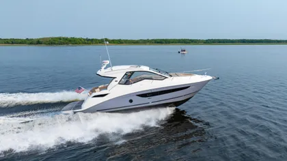 Down below, you’ll be surprised by how spacious she feels for a 35’ vessel. Two private sleeping cabins make her ideal for two couples cruising together, and the convertible dinette adds flexibility to accommodate a larger family on overnight trips. The galley is thoughtfully designed for convenience, and the head features a separate shower stall for added comfort. Her interior styling is upscale, with a blend of distressed wood flooring, dark wood and vinyl wall finishes, and cream-toned leatherette furnishings.
