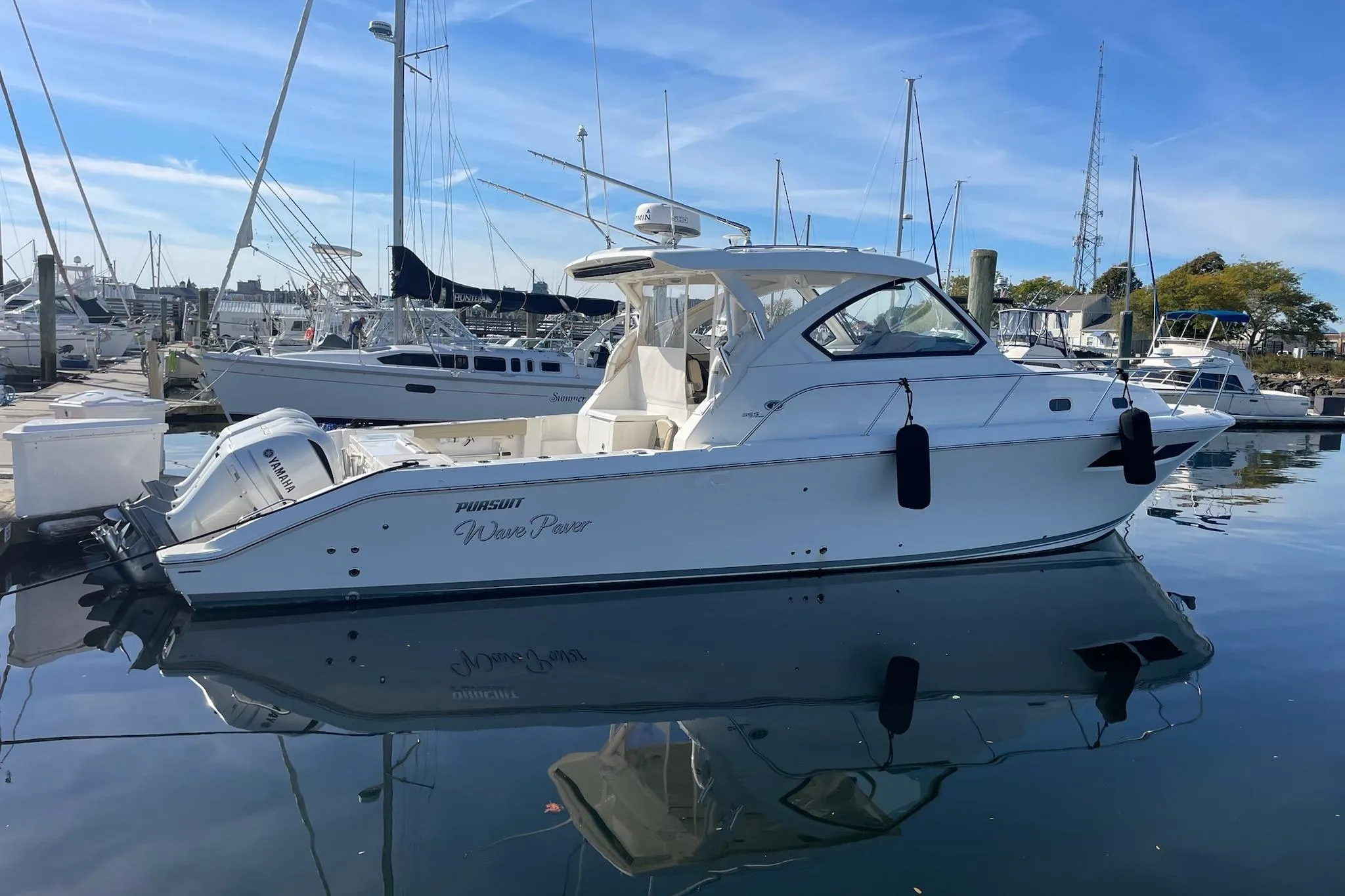 If you are purchasing a 355 Pursuit OS, look no further - this is the nicest one on the market! "Wave Paver" is owned by her second and super "Type-A" owner, incredibly clean and well cared for with meticulous service records to back it up. She features Trip 300 Yamaha 4-Strokes with 450hrs (Extended Warranty through 11/15/25), Bow Thruster, Helm Master, Helm Deck Heat and AC, Sure Shade and Reverso Fresh Water Flush System for Engines.