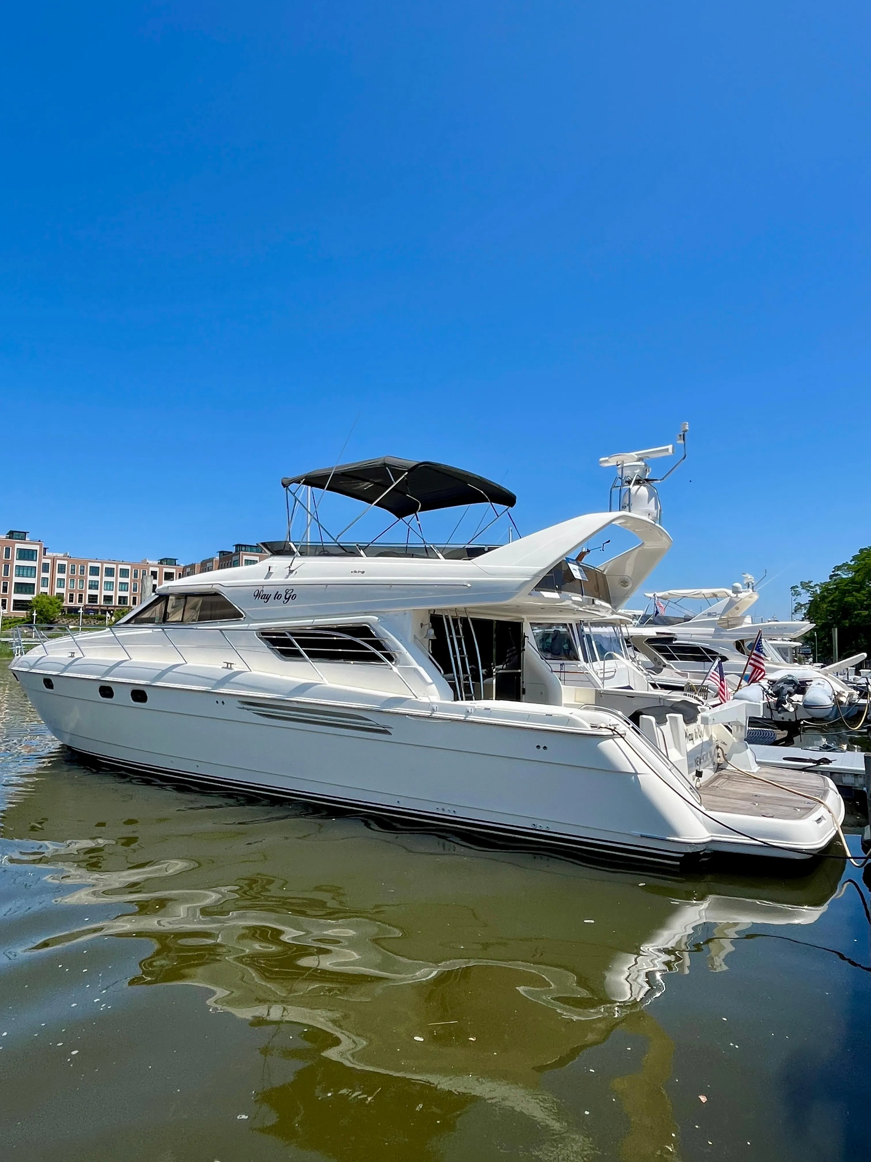 Way To Go is a 1999 Viking Sport Cruiser 61' Flybridge that combines timeless craftsmanship with spacious, well-appointed accommodations. Featuring three luxurious staterooms, two full heads, and a wide, open salon, this vessel is designed for both entertaining and extended cruising. Command her confidently from the interior helm or enjoy panoramic views from the flybridge helm while underway.