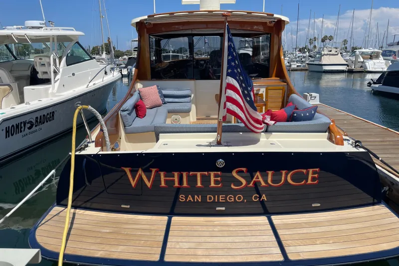 WHITE SAUCE is an exceptional example of the Hinckley 43 which is a blend of traditional Maine craftsmanship and the latest cutting-edge technology. The lobster-boat-inspired profile is classic, the shear line is long and flowing, the hull curves are just right with a tumblehome that is sensuous and eye-catching. The Talaria 43 features an innovative glass aft enclosure to the pilothouse that disappears with the touch of a button, huge opening hatches and sliding side windows to make the boat feel open and airy. If needed, with the touch of a button the pilothouse can be fully enclosed and comfortable with heat or air conditioning. A galley-up layout results in great light and visibility and connection to the living area. Below a large master cabin with a centerline queen berth and a second guest cabin provide comfortable sleeping space and share a well laid out head with separate stall shower.
