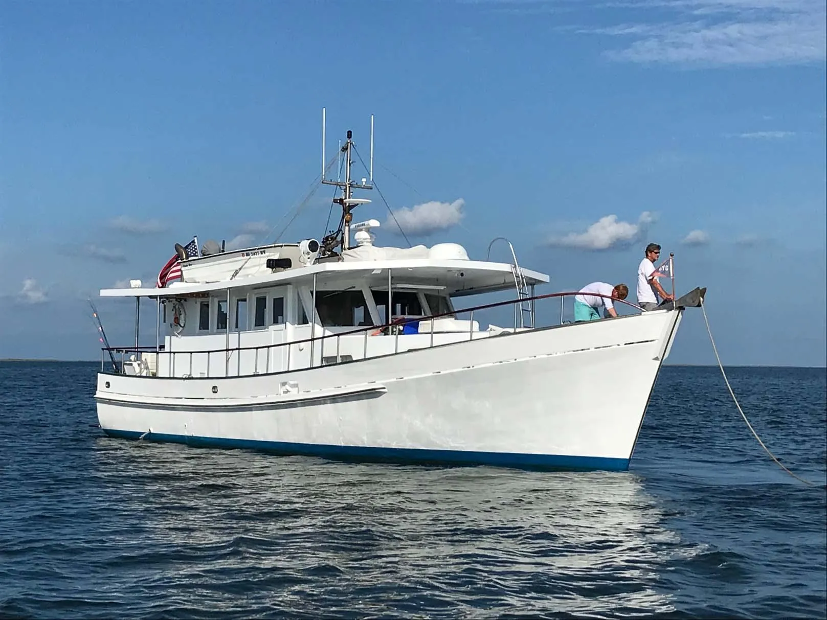 Air Conditioning comes from a marine unit for the salon, and a recently replaced roof top Dometic unit for the forward sleeping area. Dual 12v and 110v electrical systems provide redundancy for almost all systems, including lighting and pressure water systems. Hot and cold water on the aft deck sink, as well as salt and fresh water washdowns on deck and on the top deck for washing skiffs. A hydraulic engine pump powers the davit for raising and lowering skiffs, and roof racks can be easily modified for many types of flats skiff, dinghy, or duck boat. She carries 900 gallons of fuel in two stainless tanks and burns no more than 9gph with the generator running, at 9kts and 1600 rpm. (1) 12’ Twin Vee skiff with electric start 15hp Yamaha outboard included!