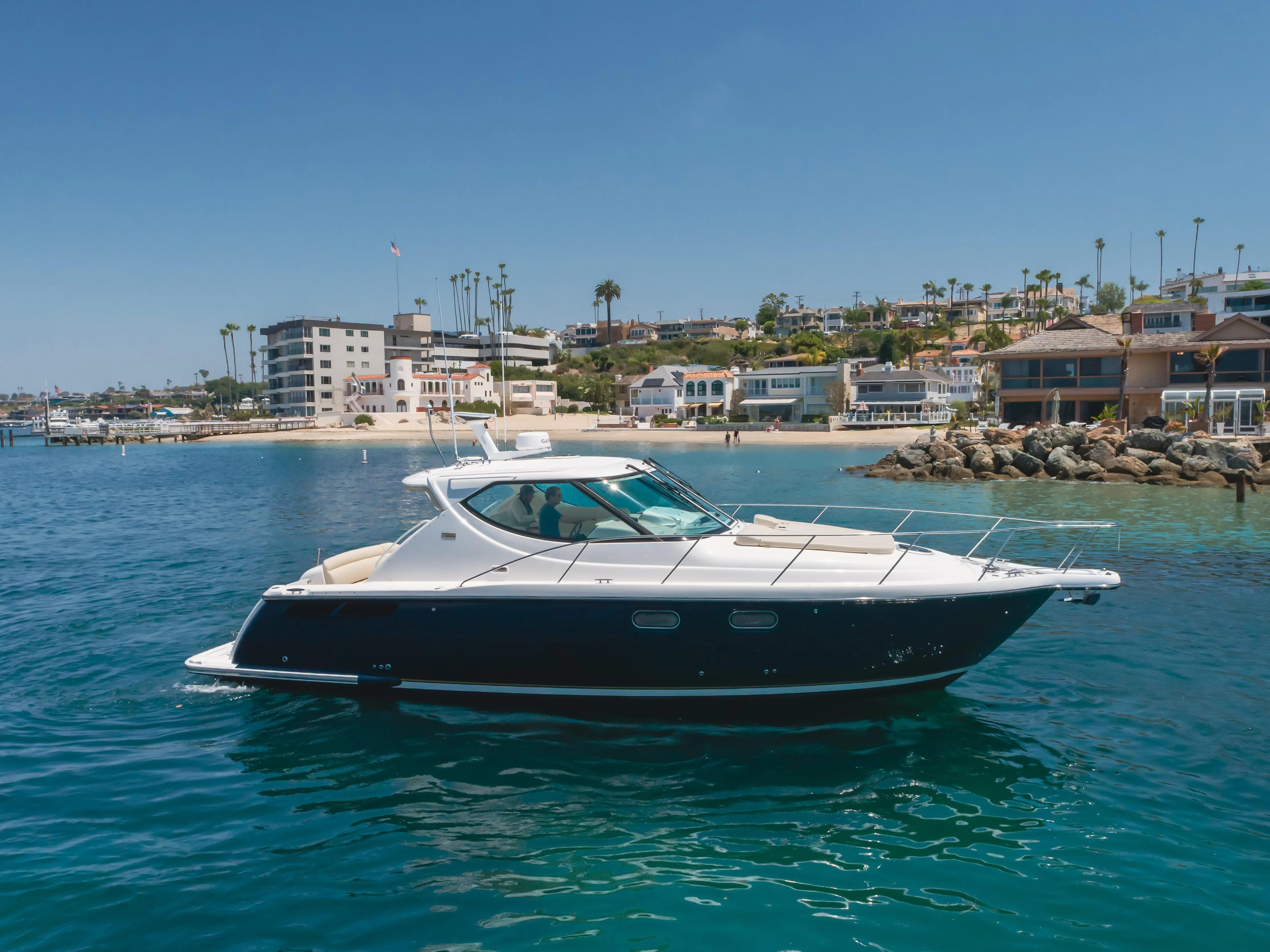 The Tiara 3900 Sovran is a mid-sized express cruiser that combines performance and luxurious accommodations in a very versatile 39-foot package. “Worked the Plan” was repowered in 2024 with brand new Volvo engines and pods that have just 64 hours on them. With comfortable seating areas on the aft deck and the padded sun lounge on the bow, she is set up perfectly for entertaining guests on a Newport Harbor cruise or a weekend getaway with the family. With a private forward stateroom and an aft stateroom, she comfortably sleeps 4. She comes with a brand new tender along with a swim platform Davit system.