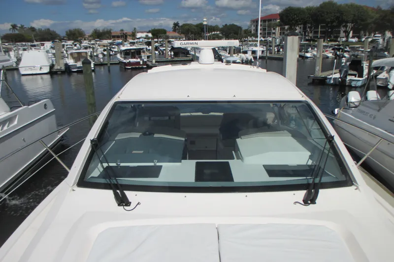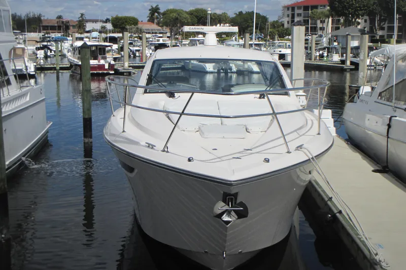 Other highly desirable features include a curved laminated windshield with a fiberglass hardtop and push-button sunroof. The helm features a wide helm chair and doublewide lounger to accommodate guests. Aft cockpit, a large lounge with backrest, fold-away transom bench seat and molded entertainment center with sink, storage and electric grill are featured.