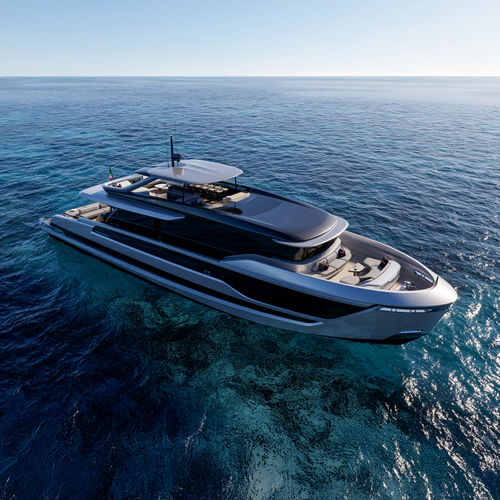 A groundbreaking architecture: volumes pushed forward, a sleek silhouette that glides over the waves, and an 85-square-meter aft deck unfolding across three levels. This is where poetry meets power.